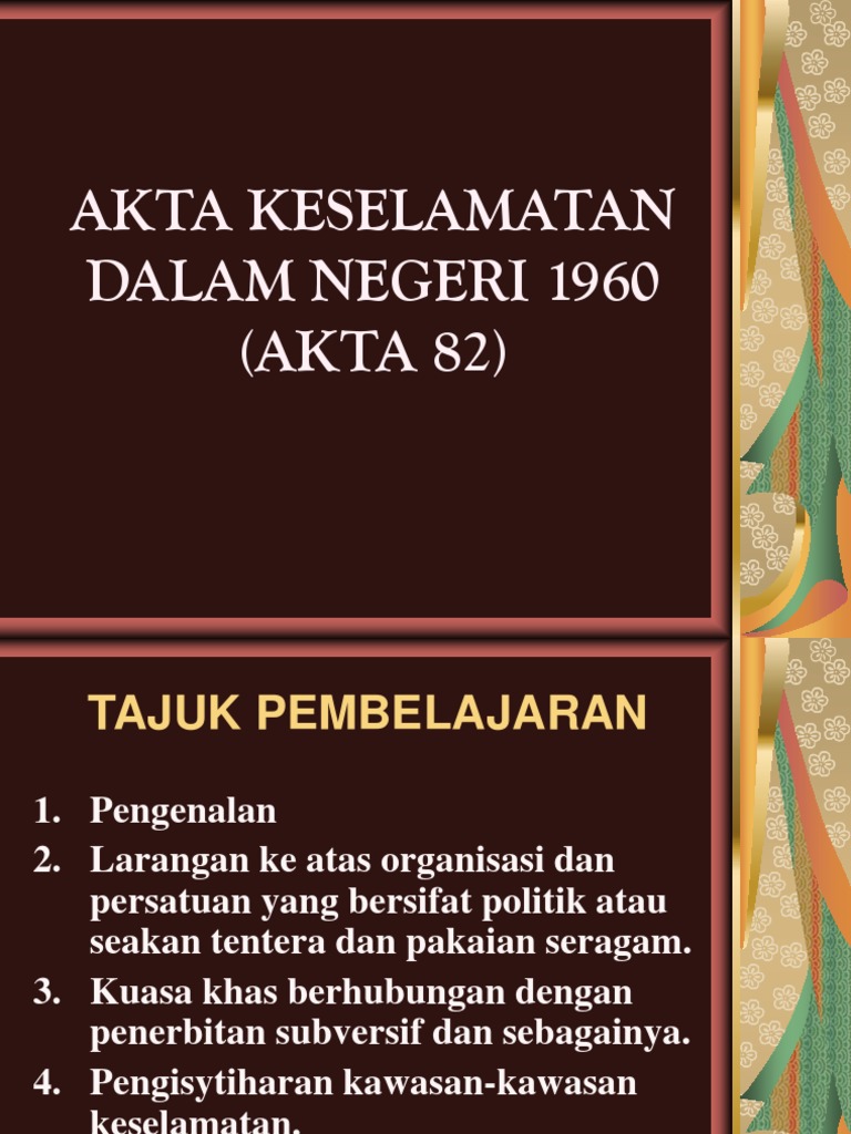 The isa allows for detention without trial or criminal charges under limited legally defined circumstances. Akta keselamatan dalam negeri 1960. Dalam negeri 1960 akta 82 tajuk pembelajaran 1. Jika pihak polis belum berpuas hati selepas 60 hari ia perlu memaklumkan kepada menteri hal ehwal dalam negeri dengan mengemukakan hujah hujah yang kukuh bagi membolehkan tahanan dilanjutkan lebih daripada 60 hari.