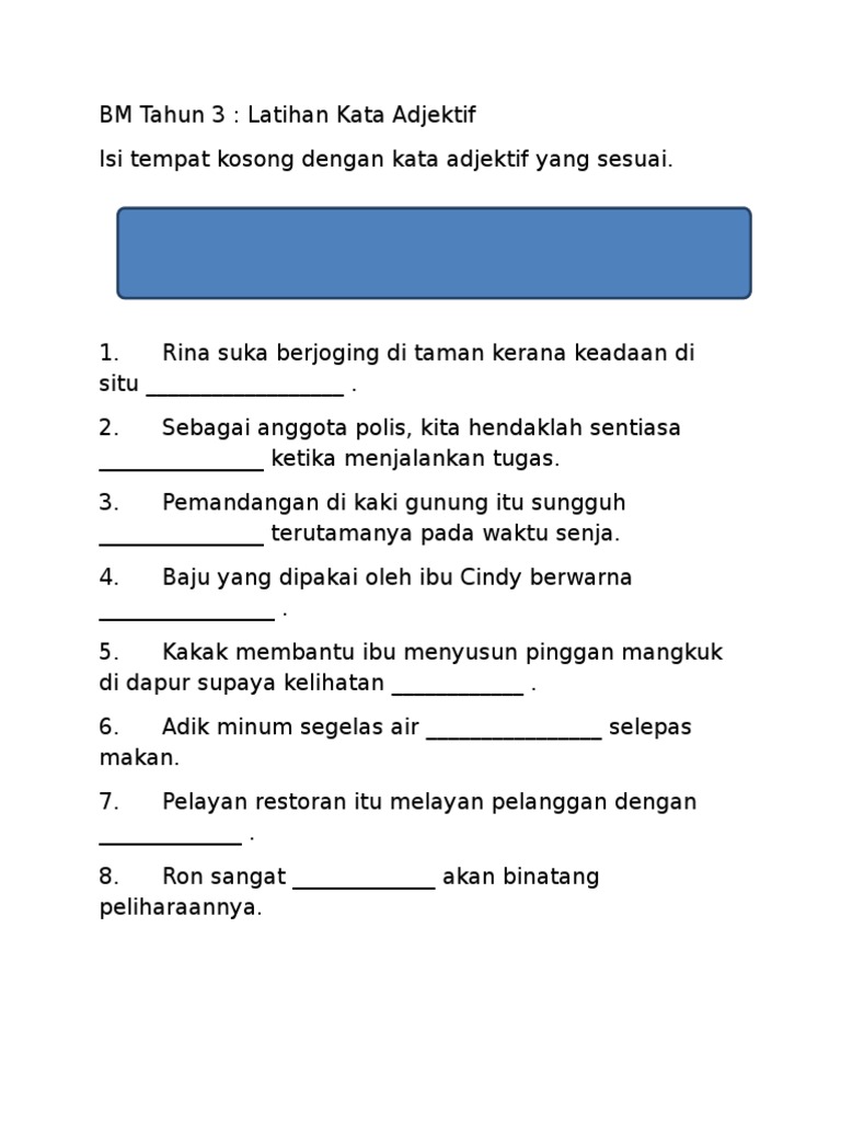 Kata adjektif boleh dibahagikan kepada sembilan subgolongan. Latihan 7 tahun yang lalu entri terbaru 2013 36 april 36 apr 11 8 apr 12 2. Latihan topikal efektif bahasa malaysia sjkc tahun 6 kssr unit 8 perubatan tradisional 1 latihan tubi kata nama 1 latihan untuk kata seru 3 nilai murni 2. Wordwall mempercepat dan memudahkan penciptaan sumber pengajaran yang sempurna.