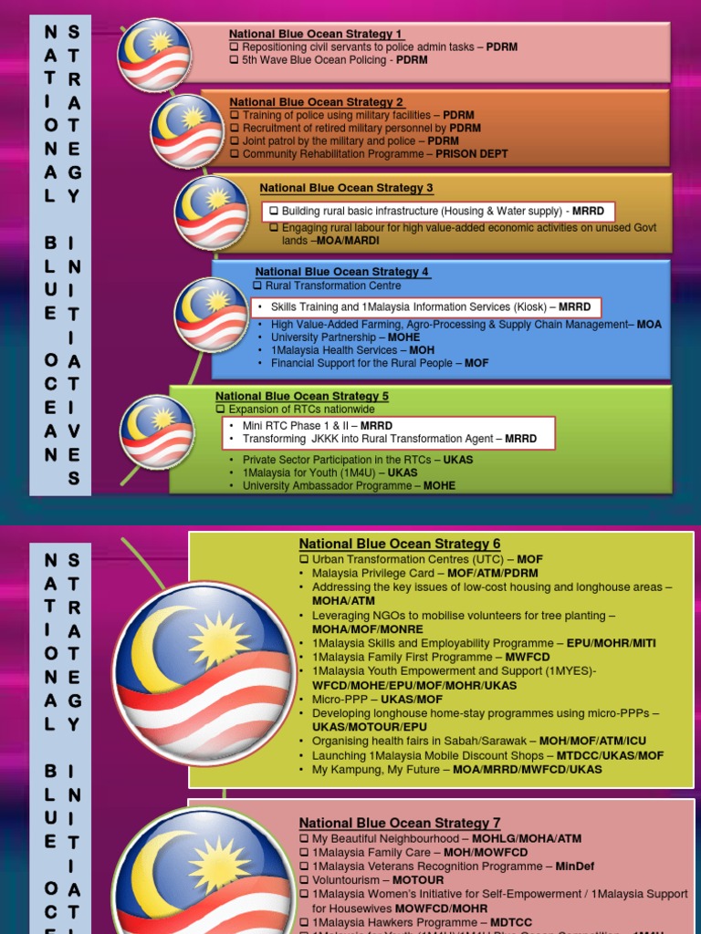 The eleventh malaysia plan used blue ocean strategy tools and frameworks to formulate high impact low cost national strategies that are able to be rapidly executed. It is about creating and capturing uncontested market space thereby making the competition irrelevant. To achieve this the malaysian government is applying the blue ocean strategy principles of high impact low cost and rapid execution to national development through national blue ocean strategy nbos the malaysian national development strategy mynds. Terdapat lebih daripada 80 jabatan dan agensi kerajaan melaksanakan 116.