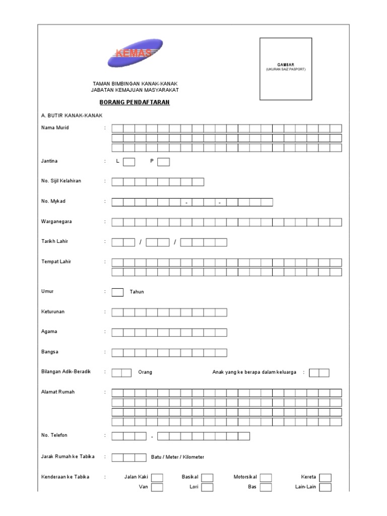 Borang Pendaftaran Tabika Kemas 2020