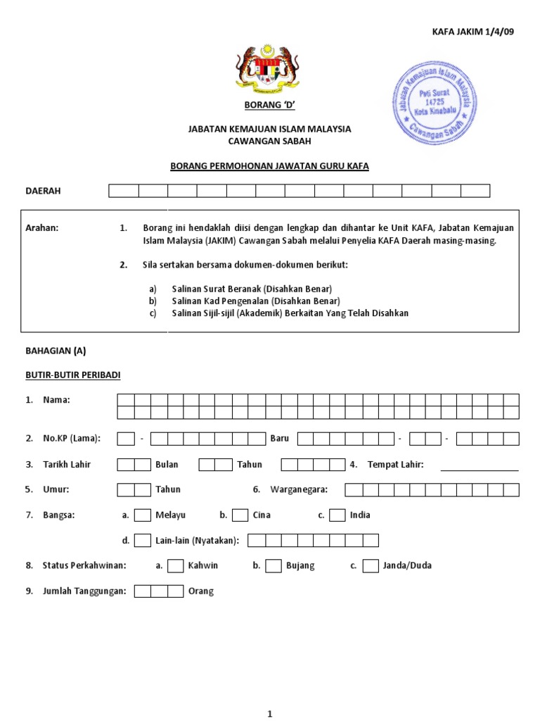 Borang permohonan penyelia kafa. Permohonan adalah dibuka melalui pejabat pendidikan negeri setiap daerah mengikut kekosongan yang ada sepanjang tahun. Blok a dan b kompleks islam putrajaya no 23 jalan tunku abdul rahman presint 3 62100 putrajaya. Jabatan kemajuan islam malaysia jakim lokasi kekosongan.