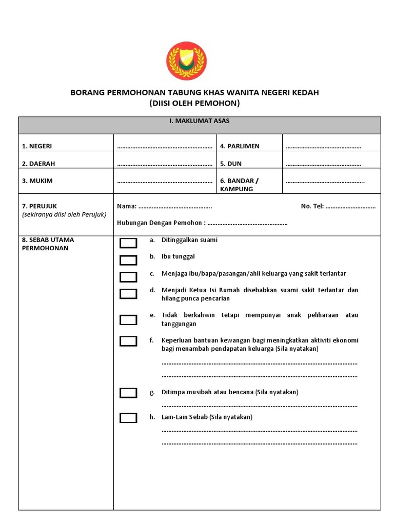 Borang permohonan tabung khas wanita negeri kedah. Share untuk makluman seluruh rakyat negeri kedah. Berita baik buat golongan wanita yang lahir dan menetap di negeri kedah. Tabung khas wanita kedah adalah merupakan salah satu daripada 10 manifesto kerajaan pakatan harapan negeri kedah yang dilaksanakan. Permohonan rm1000 tabung khas wanita negeri kedah terbaru kerajaan negeri kedah akan memberikan sumbangan khas wanita bernilai maksimum rm1 000 00 secara one off kepada mereka yang berkelayakan bagi membantu wanita di kedah sedikit sebanyak mengurangkan beban mereka.