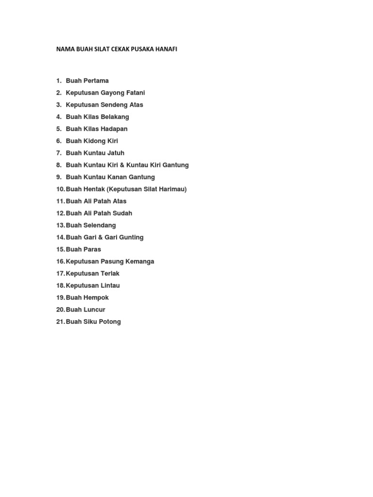 Bukan laman rasmi silat cekak. Silat silat buah silat cekak silat gayong silat gerak silat harimau silat helang silat kalimah silat kuntau silat la malay macrolanguage paperback. Berikut adalah senarai buah buah silat cekak sebanyak 21 buah. Ustaz hanafi telah membuat beberapa perubahan dengan membuang dan mengabungkan beberapa buah di dalam sistem matapelajaran ini kerana beliau berpendapat ada beberpa buah yang tidak praktikal untuk digunakan.