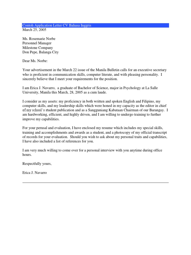 Membuat surat lamaran pekerjaan dalam bahasa inggris cover letter surat lamaran pekerjaan atau yang dalam bahasa inggris dikenal sebagai job application letter cover letter adalah dokumen yang dikirimkan bersama cv curriculum vitae resume atau daftar riwayat hidup yang juga merangkum kompetensi yang dimiliki. Surat lamaran harus dibuat secara. Untuk membuat cv resume silahkan di pelajaran cara membuat resume. Mencari pekerjaan adalah satu perkara yang akan dilalui oleh hampir setiap orang pada satu ketika dalam kehidupan mereka.