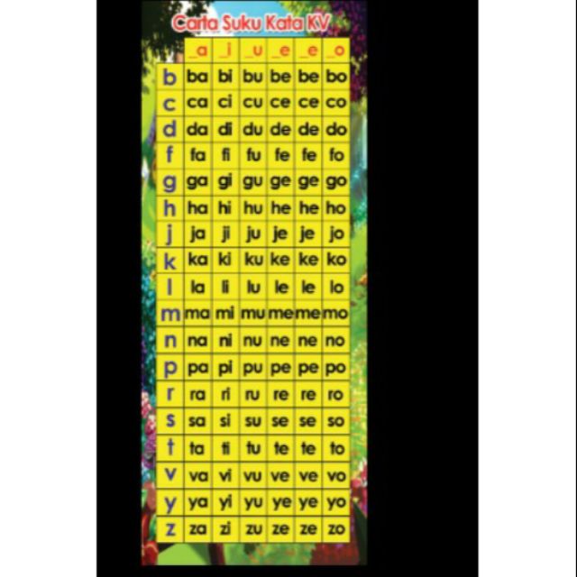 Carta suku kata bahasa melayu. Terdapat 18 fonem konsonan asli bahasa melayu. Membina suku kata kvk daripada huruf huruf. Kad carta suku kata kv ini saya perolehi daripada facebook group guru pemulihan khas malaysia. Dari segi cara sebutan seperti yang tercatat dalam carta di atas konsonan asli bahasa melayu terbahagi kepada tujuh iaitu letupan letusan geseran getaran sisian sengauan dan separuh vokal.