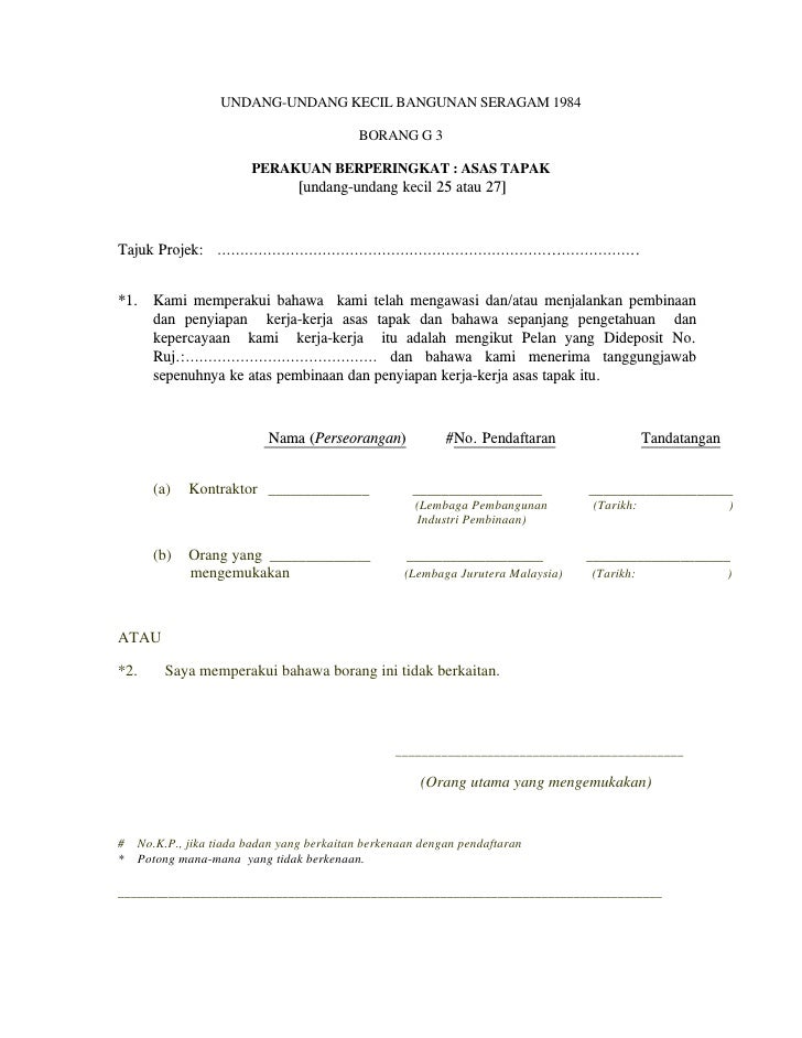 Mengikut akta pengambilan tanah borang g tidak boleh diberikan kepada sesiapa seperti yang dinyatakan dibawah seksyen 14 2. Mengikut peraturan 14 1 peraturan peraturan elektrik 1994 menyatakan perakuan penyeliaan dan penyiapan dan perakuan ujian dalam peraturan 12 dan 13 hendaklah masing masing dalam borang g dan h yang ditetapkan dalam jadual pertama. Pemunya atau pengurusan pepasangan hendakiah mengemukakan perakuan penyeliaan dan penyiapan dan perakuan ujian borang g dan h dalam jadual pertama kepada pemegang lesen atau pihak berkuasa bekalan mengikut mana mana yang berkenaan bagi menerima elektrik daripada pemegang lesen atau pihak berkuasa bekalan.