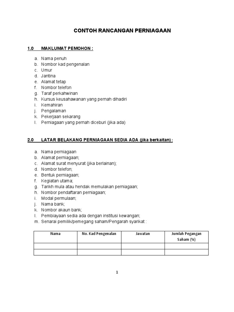 Senarai kandungan elemen muka surat ringkasan eksekutif 1 0 pengenalan 2 0 latar belakang perniagaan 3 0 latar belakang pemilik 4 0 rancangan pentadbiran organisasi 4 1 struktur organisasi 4 2 spesifikasi tugas pentadbiran 4 3 kos pentadbiran 4 3 1 jadual imbuhan atau gaji pekerja disertakan jadual kadar kwsp perkeso 4 3 2 bentuk insentif pekerja 4 4 kos perbelanjaan lain. Latihan asas perniagaan bil. Zm enterprise 4 0 latar belakang perniagaan nama perniagaan. Zm enterprise no 13 bangunan mara bandar marang 21600 marang terengganu no telefon.