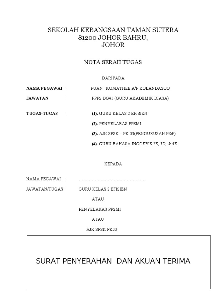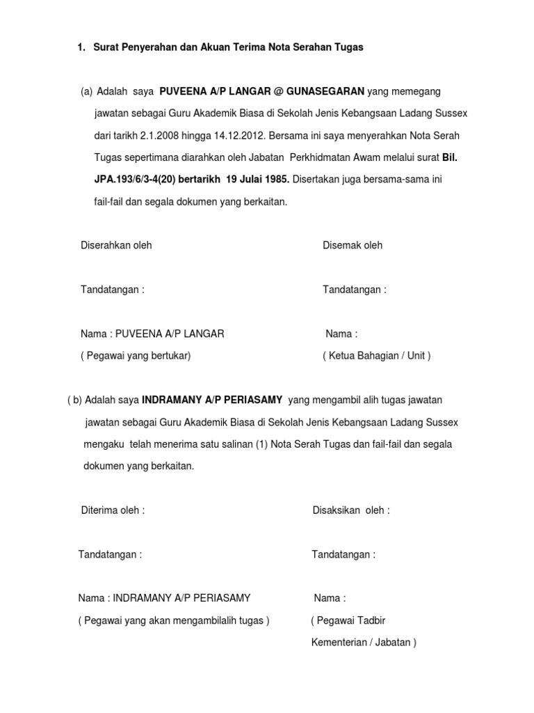 Keputusan egtukar telah dikeluarkan pastinya guru guru mula mencari contoh nota serah tugas perpindahan mengikut lokasi yang dipohon. A adalah saya nasaruddin bin darus yang memegang jawatan guru penolong di kementerian jabatan sekolah kebangsaan chepir dari tarikh 1 1 2006 hingga 16 februari 2019. Guru biasa tugas utama bagi seseorang guru adalah untuk mengajar dan mendidik. Bersama sama ini menyertakan nota serah tugas sepertimana diarahkan oleh jabatan perkhidmatan awam melalui surat bil jpa 193 6 3 4 20 bertarikh 19 julai 1985.