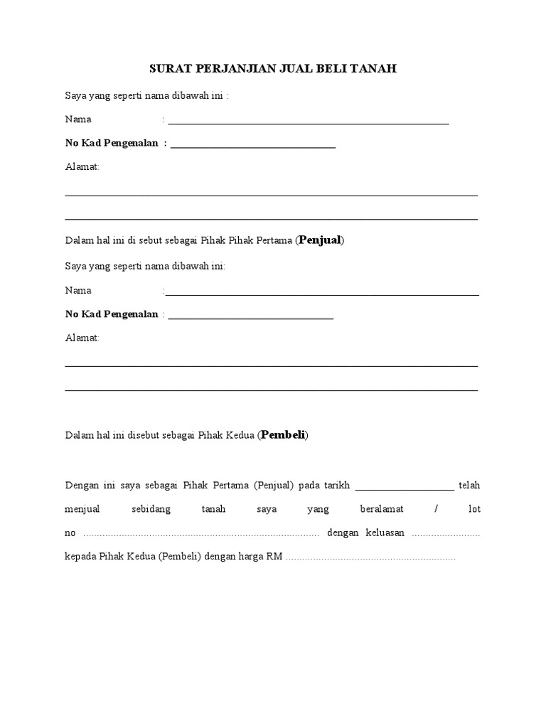 Contoh perjanjian jual beli tanah. Surat perjanjian jual beli tanah tanah atau lahan yang tersedia semakin lama semakin menyempit terlebih lagi di kota kota besar. Surat perjanjian sebagai surat yang dibuat oleh dua pihak secara bersama bahkan seringkali melibatkan pihak ketiga sebagai penguat. Beberapa hal penting yang tertera di surat perjanjian jual beli tanah mungkin akan terdengar awam dan sulit di mengerti. Pada artikel sebelumnya kita telah membahas mengenai surat perjanjian jual beli rumah sederhana.