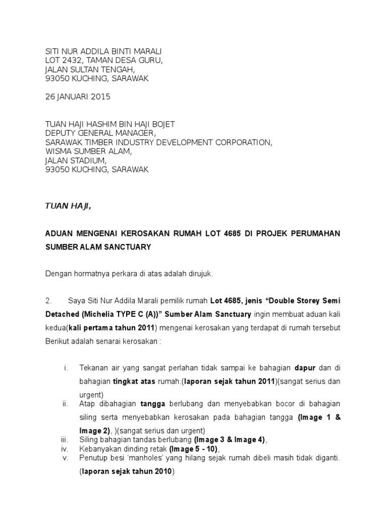 Contoh surat aduan kerosakan rumah kepada pemaju. Contoh surat aduan kerosakan rumah contoh surat rasmi aduan kerosakan rumah minimalis contoh surat rasmi aduan kerosakan rumah adat contoh surat rasmi aduan kerosakan rumah sederhana contoh surat. Contoh surat aduan kepada majlis perbandaran contoh surat aduan kepada tnb contoh surat aduan kerosakan contoh surat aduan pelanggan. Contoh surat aduan rumah download contoh surat aduan. Contoh surat rasmi aduan kerosakan jalan raya contoh o via contoho blogspot co id.
