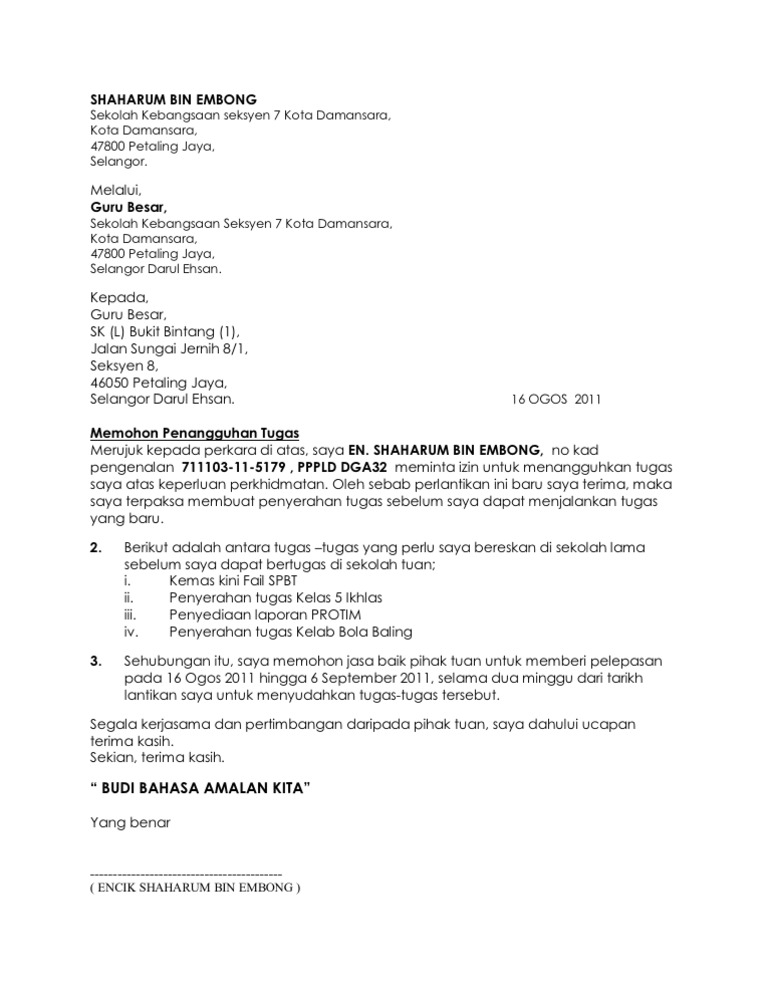 Sehubungan dengan itu saya memohon pertimbangan dan jasa baik pihak tuan untuk memohon penangguhan melapor diri di nama sekolah baru bagi menyiapkan tugasan sekarang supaya tidak menimbulkan masalah. Saya mengharapkan agar pihak tuan dapat mempertimbangkan perkara ini. Contoh surat makluman latihan murid dan raptai su. Surat penangguhan lapor diri.