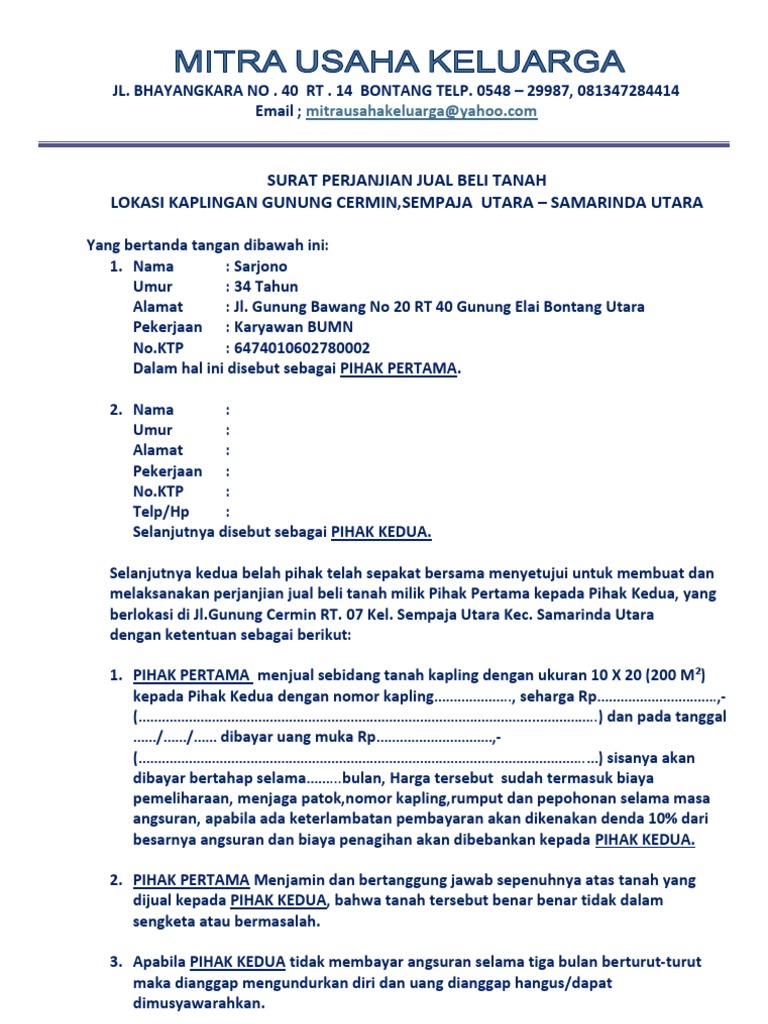 Pembayaran berikutnya akan dilakukan 1 satu bulan dari tanggal penandatangan perjanjian ini untuk kepengurusan kpm kredit pemilikan mobil oleh pembeli. Dalam surat pernyataan jual beli tanah atau akad jual beli tanah ajb anda akan menemukan serangkaian pasal pasal penting. Jika nilainya kecil maka bukti bisa berupa kwitansi atau strukt pembelanjaan. Surat perjanjian jual beli cash kredit kavling hasanah.