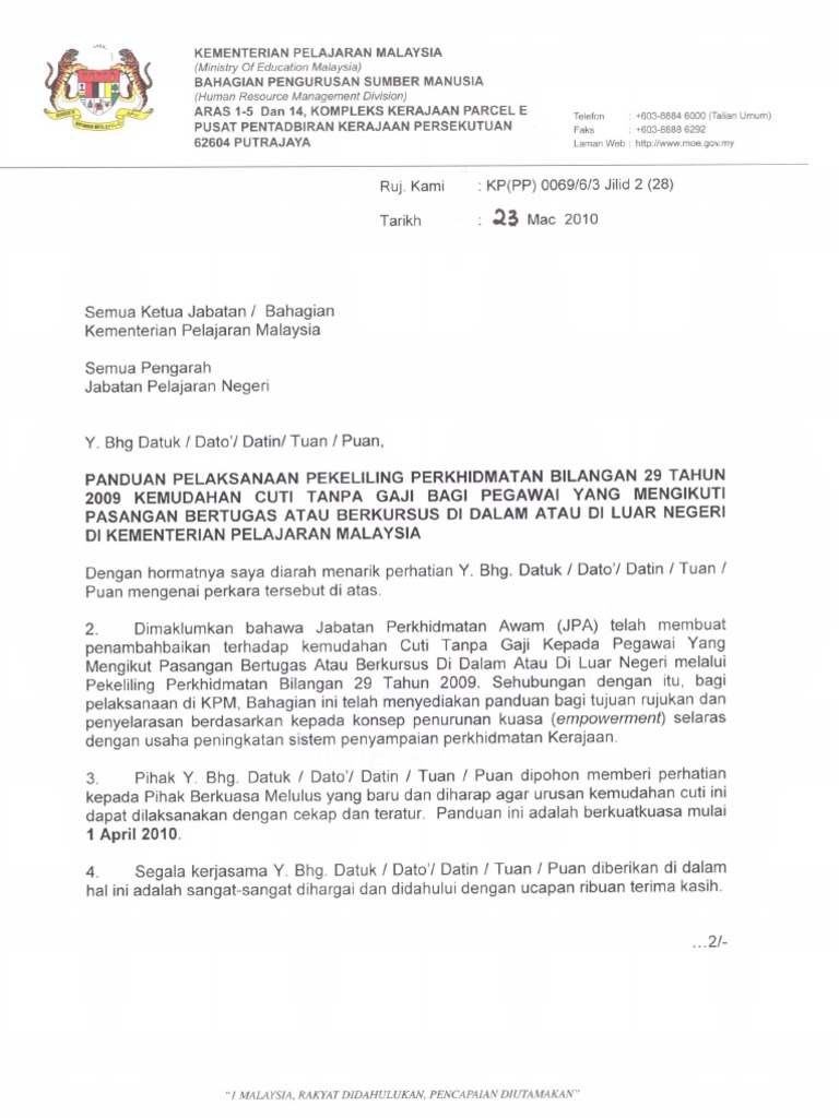 Contoh surat cuti tanpa gaji untuk urusan berikut. Cuti tanpa gaji mengikut pasangan bertugas atau berkursus di dalam atau di luar negara pekeliling perkhidmatan bil 1 92 dan bil 14 2005 1.