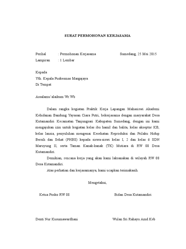 Surat permohonan kerjasama format dan contoh surat kerjasama kegiatan produk surat permohonan kerjasama merupakan sebuah surat resmi yang dibuat untuk menawarkan sebuah permintaan atau permohonan kerjasama kepada seseorang atau perusahaan agar mereka mau menerima tawaran yang kita berikan. Namun jika anda masih merupakan seorang siswa atau mahasiswa dan mendapat tugas untuk menulis surat permohonan kerjasama maka mungkin anda harus membutuhkan beberapa bahan referensi. Contoh surat permohonan kerjasama dengan puskesmas surat w download contoh surat permohonan kerjasama yang baik dan benar suratpermohonankerjasama test kesehatan1 mou puskesmas sekolah 15 kumpulan contoh surat permohonan dana izin bantuan. Contoh surat permohonan kerjasama.