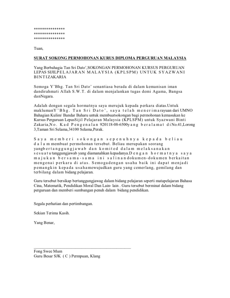 Contoh surat sokongan ketua jabatan untuk sambung belajar. Contoh surat sokongan majikan yang menyokong tawaran belajar admin tidak bertanggungjawab atas sebarang kesilapan atau kesalahan ejaan atau tatabahasa. Contoh diberi sebagai rujukan semata by illiyya in types government politics employment and wills and trusts. The collection that comprising chosen picture and the best among others. Kerana dia tak tahu apa yang dibuat oleh pekerja itu.