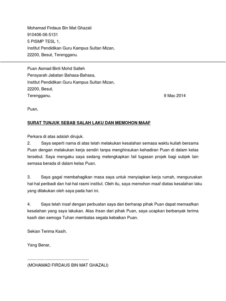Contoh surat tunjuk sebab melakukan kesalahan. Yang kedua jika anda ialah seorang pekerja yang menerima. Surat tunjuk sebab salah laku dan memohon untuk menyambung kembali pengajian. Berikut ialah contoh surat tunjuk sebab dalam konteks pekerjaan yang selalunya dikeluarkan oleh majikan kepada pekerja jika pekerja melakukan sesuatu kesalahan yang melanggar tatatertib. Surat tunjuk sebab dalam konteks pekerjaan biasanya dikeluarkan oleh majikan kepada pekerja yang telah melakukan sesuatu kesalahan yang melanggar kontrak pekerjaan seperti kesalahan lewat datang kerja cuti kecemasan tidak hadir kursus dan lain lain lagi.