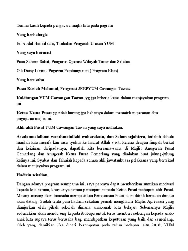 Berikut adalah contoh ucapan pengerusi majlis bagi acara majlis makan malam untuk dikongsi dan dijadikan panduan bersama sama. Majlis makan malam temu mesra kelab kimia oleokimia teknologi kimia 2014 teks ucapan muhammad hilman bin abdul mustapa ketua pengarah majlis makan malam jumaat 25 april 2014 hotel bangi putrajaya bismillahirrahmanirrahim. Teks ucapan pengacara majlis makan malam mpv 2004. Mengumumkan ketibaan timbalan menteri pelajaran 1 kementerian pelajaran malaysia yb.