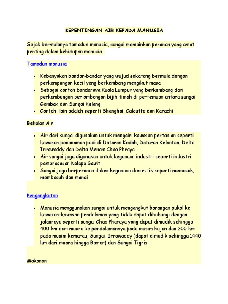 Dalam kehidupan kepentingan air kepada manusia. Antara kepentingan air kepada manusia ialah sebagai keperluan dalam rumahtangga kegunaan dalam bidang pertanian pengangkutan dan. Krisis ini banyak membuka mata masyarakat dan kerajaan tentang kepentingan air. Krisis air di lembah kelang yang melanda negara pada tahun 1998 dan awal tahun 2002 yang lalu adalah bukti jelas bahawa betapa pentingnya air di dalam kehidupan kita. Ini adalah berdasarkan kepada kiraan satu mililiter air diperlukan untuk setiap kalori makanan.
