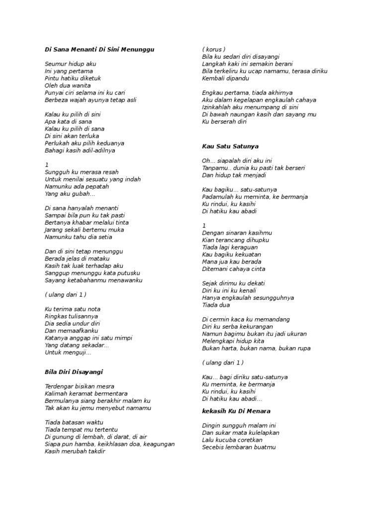 Di sana menanti di sini menunggu lyrics. Sebelumnya lagu ini pernah dibawakan oleh ukays. Dan di sini tetap menunggu berada jelas di mataku kasih tak luak terhadap aku sanggup menunggu kata putusku sayang ketabahanmu menawanku ulang ku terima satu nota ringkas tulisannya dia sedia undur diri dan. Seumur hidup aku ini yang pertama pintu hatiku diketuk oleh dua wanita punyai ciri selama ini ku cari berbeza wajah ayunya tetap asli kalau ku. Kalau ku pilih di sini apa kata di sana kalau ku pilih di sana di sini akan terluka.