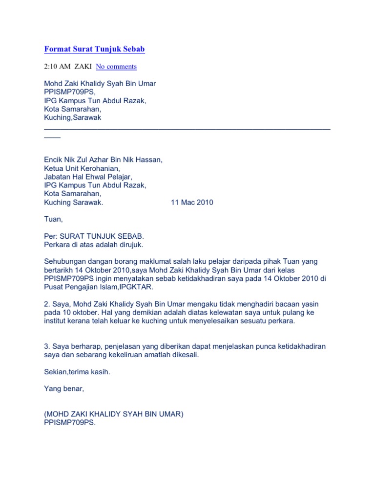 Format surat tunjuk sebab. Format gambar contoh surat tunjuk sebab lewat hantar tuntutan yang baik dan benar 2019. Kenali apa itu surat tunjuk sebab tujuan pemberian surat tunjuk sebab ini adalah bukan menuduh korang sudah melakukan kesalahan tersebut tetapi majikan ingin meminta anda menulis sebab sebab atau apa cerita yang sebenar disebalik berlakunya perkara perkara yang mungkin melanggar polisi syarikat. Pengurus tuan puan surat tunjuk sebab lewat hadir kerja saya dengan segala hormatnya merujuk kepada perkara saya lewat hadir kerja pada. Berikut dikongsikan contoh surat tunjuk sebab terbaik yang mudah dan ringkas sekiranya anda ingin tahu apa itu surat tunjuk sebab ianya adalah surat perlu ditulis oleh pekerja yang telah membuat sesuatu kesalahan yang melanggar kontrak.