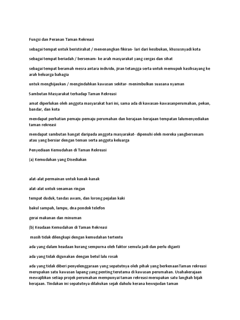 Tempat rekreasi fungsi dan peranan taman rekreasi sebagai tempat untuk beristirahat menenangkan fikiran lari dari kesibukan khususnya di kota sebagai tempat beriadah bersenam ke arah masyarakat yang cergas dan sihat sebagai tempat beramah mesra antara individu jiran tetangga serta untuk memupuk kasih sayang ke arah keluarga bahagia. Sebagai tempat untuk beristirahat menenangkan fikiran lari dari kesibukan khususnya di kota. Fungsi dan peranan taman rekreasi sebagai tempat untuk beristirahat menenangkan fikiran lari dari kesibukan khususnya. Demi menjimatkan kos dan perbelanjaan mereka menyingkirkan pembinaan padang permainan dan taman rekreasi daripada projek pembinaan perumahan.
