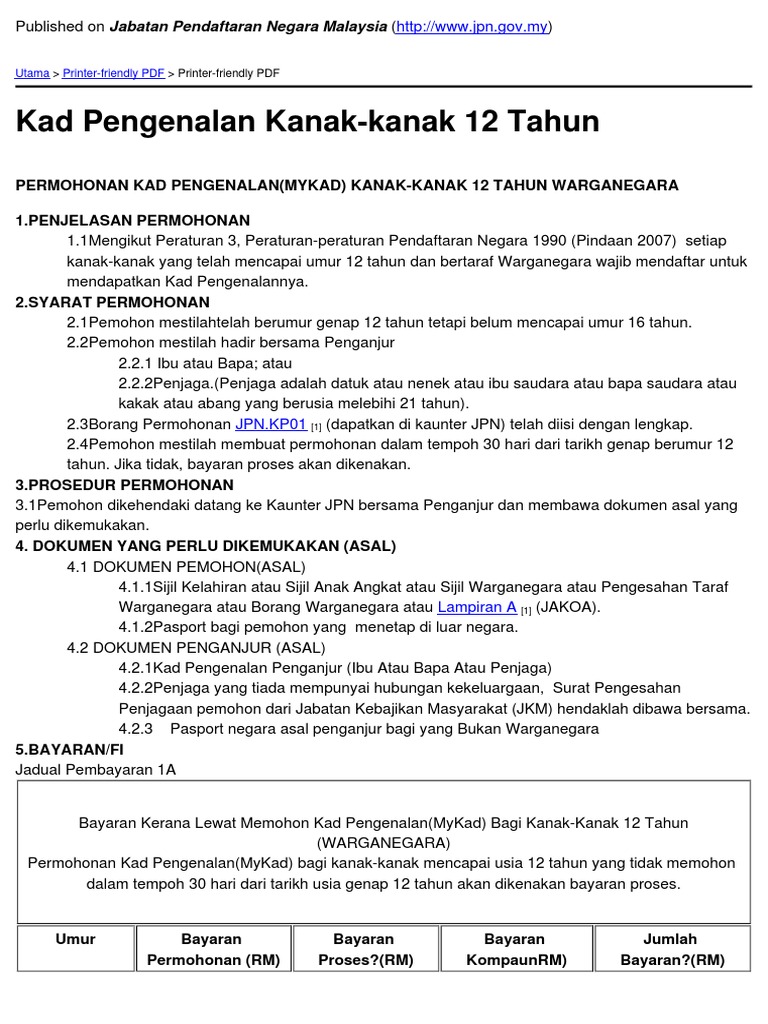 Semasa ambil kad pengenalan staf jpn pesan kalau umur mencapai 18 tahun anak kena memohon gantian kad pengenalan. Hadir bersama penganjur ibu atau bapa atau penjaga. Permohonan kad pengenalan kanak kanak 12 tahun. Bayaran kerana lewat memohon kad pengenalan mykad bagi kanak kanak 12 tahun warganegara permohonan kad pengenalan mykad bagi kanak kanak mencapai usia 12 tahun yang tidak memohon dalam tempoh 30 hari dari tarikh usia genap 12 tahun akan dikenakan bayaran proses.