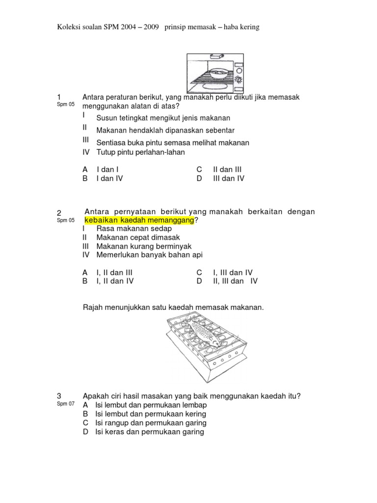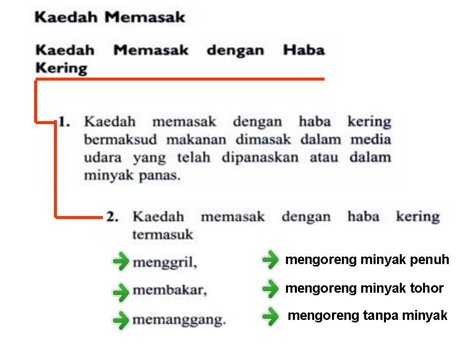 Menyatakan ciri hasil masakan setiap kaedah memasak. Makanan dimasak sama ada di dalam ketuhar gril atau di atas bara api yang panas. Menyatakan kaedah memasak menggunakan haba kering dan haba lembap. Pada entry yang lepas saya ada menceritakan tentang prinsip memasak.