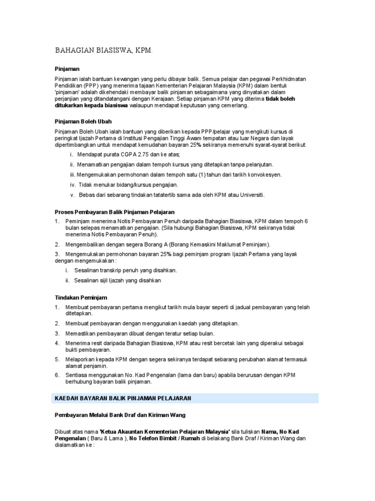 Sebarang lebihan bayaran akan dikembalikan setelah bayaran penyelarasan dibuat atau setelah kementerian pendidikan tinggi menerima keseluruhan bayaran daripada majikan jika ada. Kami warga bahagian biasiswa dan pembiayaan kementerian pelajaran malaysia dengan penuh tekad dan iltizam berikrar dan berjanji akan menumpukan seluruh tenaga dan usaha kami untuk. Memastikan surat tawaran biasiswa atau pinjaman dikeluarkan kepada pelajar dan pegawai perkhidmatan pendidikan dalam tempoh 3 minggu selepas calon diperaku dan diluluskan oleh pihak yang melulus. Peminjam hendaklah membayar balik keseluruhan jumlah pinjaman yang diterima semasa pengajian kepada kementerian.