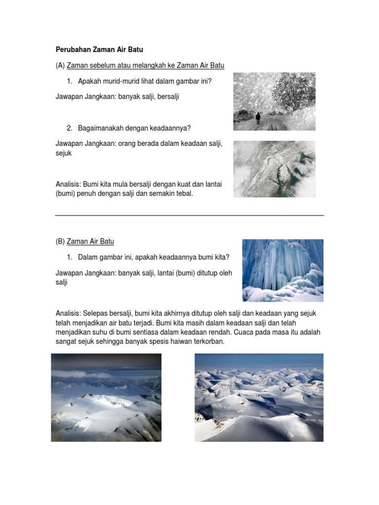 2 4 ciri ciri zaman air batu 1 aras laut 2 kehidupan manusia 3 suhu 4 tumbuhan 5 binatang 6 fizikal bumi 2 5 perubahan zaman air batu 1 keadaan glasier di alaska 2 pulau yang mengalami kenaikan aras laut 3 tasik dayang bunting 4 binatang zaman air batu 5 radiasi. Question notes kesan perubahan zaman air batu akhir di asia tenggara sejarah upsr darjah 4. Ii ais mula mencair. I suhu bumi meningkat.