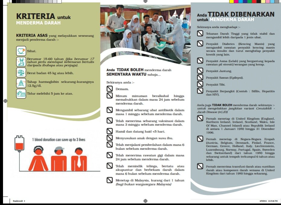Boleh menyelamatkan nyawa seseorang bagi orang orang yang berisiko tinggi kehilangan darah seperti akibat kemalangan dan juga ibu yang melahirkan anak darah yang didermakan adalah sangat penting. Berumur di antara 18 60 tahun untuk pertama kali menderma. Berumur di antara 18 70 tahun untuk yang pernah menderma. Kriteria penderma darah anda layak menderma darah sekiranya.