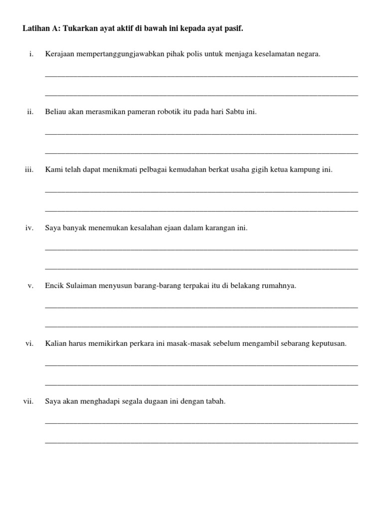 Tukarkan ayat ayat pasif di bawah supaya menjadi ayat aktif. Latihan spm 2 tukarkan ayat ayat aktif berikut kepada ayat pasif. Beberapa orang pekerja sedang menebas semak samun di kiri dan di kanan lebur raya itu. Mesin tebu itu telah dibaiki oleh pak abu.