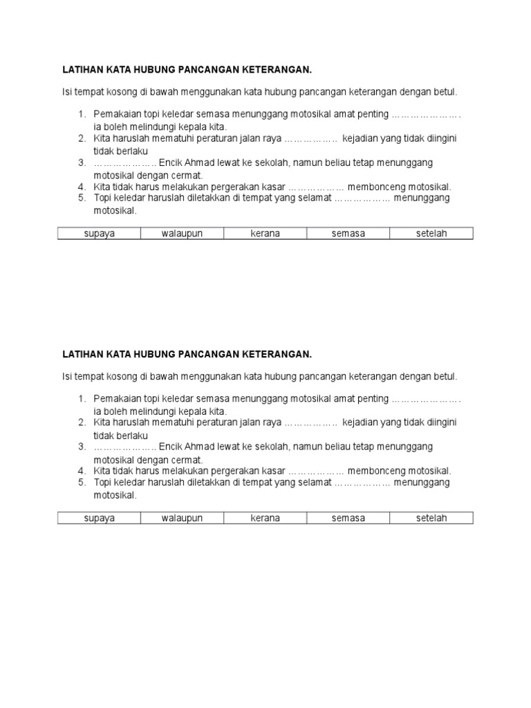 Koleksi soalan soalan objektif 5 kata hubung latihan bertubi 5 isi tempat kosong dengan jawapan yang paling sesuai. Latihan bahasa melayu 16 latihan bm tahun 1 12 nota dan latihan bahasa melayu 19 pantun 4 pengacaraan 20 pengumuman 1 persembahan 7 puisi 69 rekreasi 1 about us. Latihan isi tempat kosong dalam ayat ayat di bawah dengan jawapan yang paling sesuai. Kata hubung pancangan keterangan kata hubung pancangan relatif.