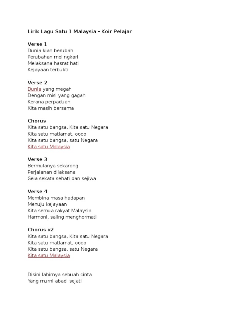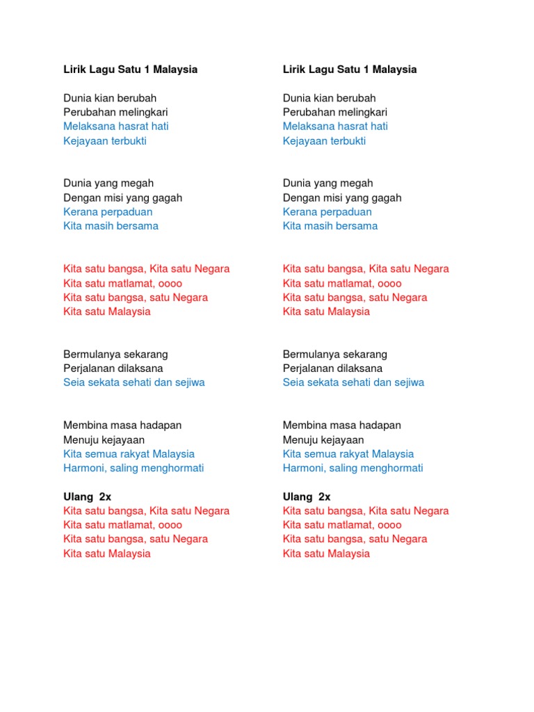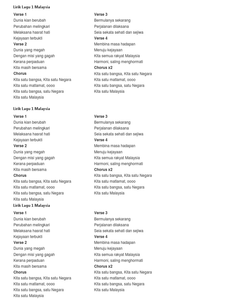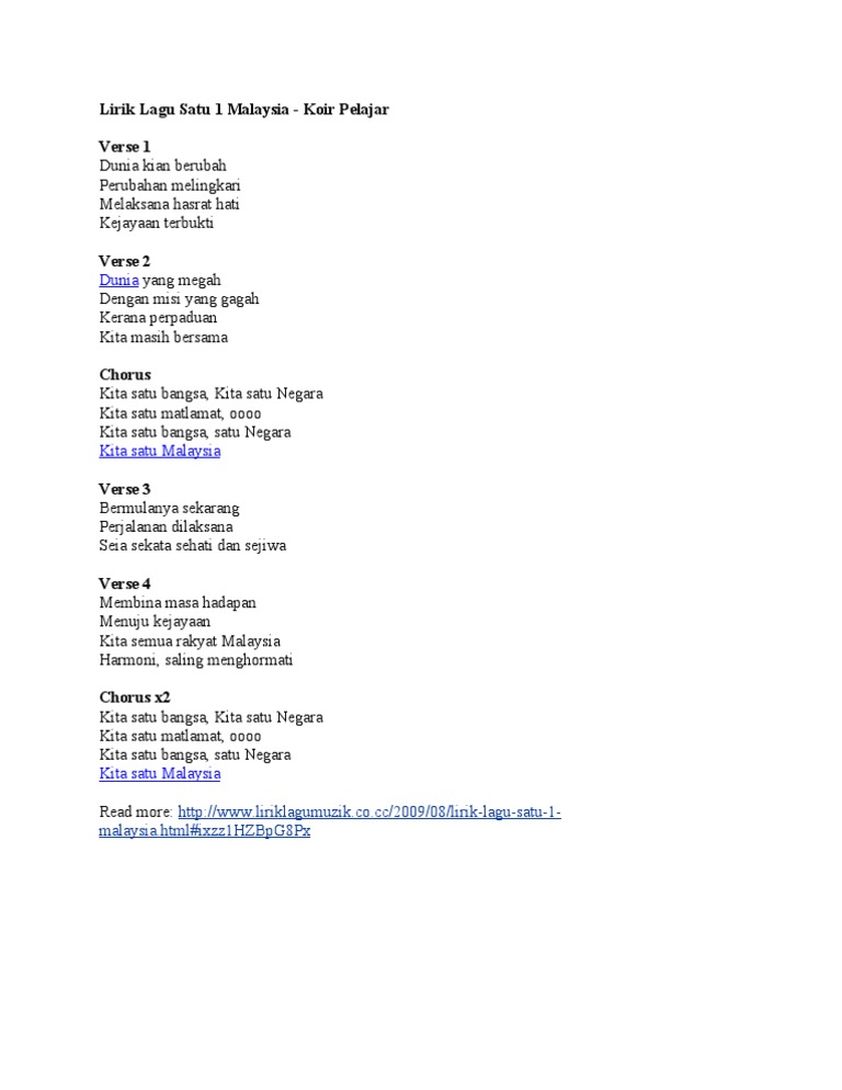 Lirik lagu 1 malaysia kita satu bangsa. Dunia yang megah dengan misi yang gagah kerana perpaduan kita masih bersama chorus kita satu bangsa kita satu negara kita satu matlamat oooo kita satu bangsa satu negara kita satu malaysia. Lirik lagu satu 1 malaysia koir pelajar verse 1 dunia kian berubah perubahan melingkari melaksana hasrat hati kejayaan terbukti verse 2 dunia yang megah dengan misi yang gagah kerana perpaduan kita masih bersama chorus kita satu bangsa kita satu negara kita satu matlamat oooo kita satu bangsa satu negara kita satu malaysia verse 3. Bermulanya sekarang perjalanan dilaksana. Lirik lagu satu malaysia lagu tema rasmi 1 malaysia berdiri teguh di bumi nyata pupuk semangat satu malaysia sepakat rakyat.