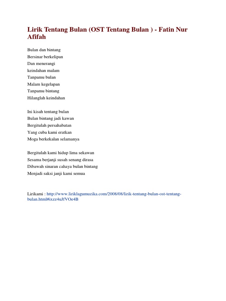 Berikut merupakan lirik lagu tentang bulan dari fatin nur afifah. Bulan bintang jadi kawan bergitulah persahabatan yang cuba kami eratkan moga berkekalan selamanya. Lirik lagu tentang bulan. Kim tae woo feat.
