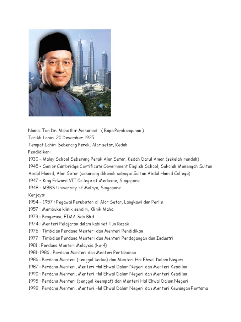 Tun mahathir dilahirkan pada 10 julai 1925 di kampung seberang perak alor setar kedah. Mahathir bin mohamad dilantik menjadi perdana menteri malaysia yang ke empat pada 16hb julai 1981. Hasratnya dijelaskan dalam apa yang dinamakan wawasan 2020 yang. Atikah rashid tun dr mahathir bin mohamad adalah seorang pemikir dan revolusiner.