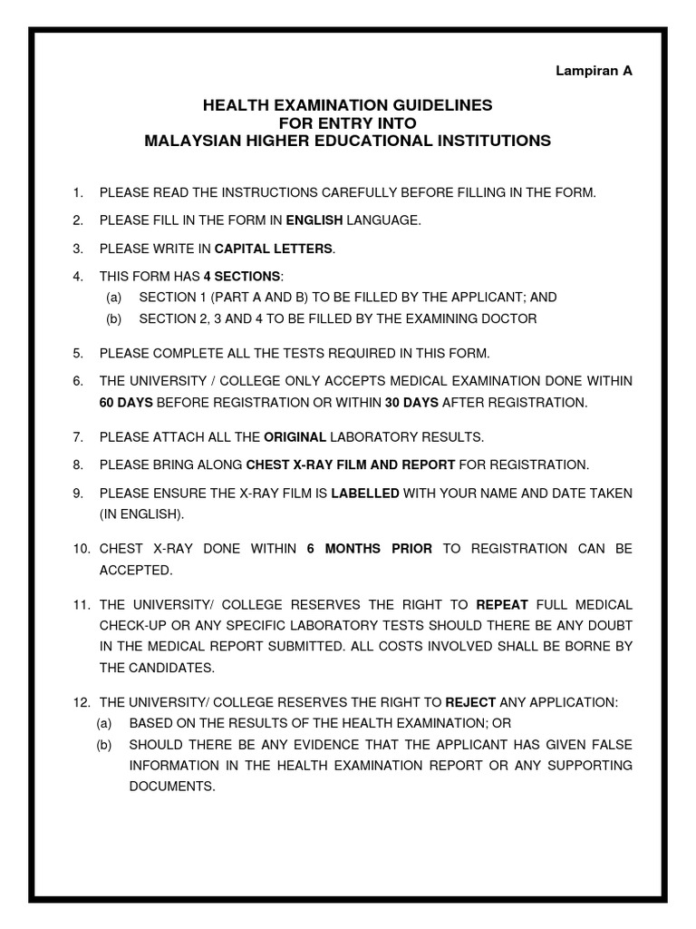 Medical check up form malaysia. The pantai medical centre kuala lumpur is based in malaysia specializes in delivering diagnostic and health screening packages as well as advanced imaging services and other medical treatments. Your typical journey in medical checkup note. Download and print the medical examination form. Click here to download the sample this form is completed by one of the previous student which accepted by immigration malaysia just for your reference kindly fill up the form exactly like this.