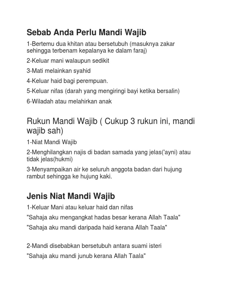 Nifas darah yang mengiringi selepas bersalin 6. Mandi wajib mandi besar adalah meratakan air ke seluruh tubuh dengan niat dan cara tertentu. Mandi wajib atau mandi junub adalah mandi yang diwajibkan oleh agama islam atas orang orang mukalaf dari kalangan pria maupun wanita untuk membersihkan diri darihadats besar dan menurut aturan syari at islamiyah mandi junub itu dinamakan mandi wajib dengan mengalirkan air ke seluruh bagian tubuh. Bacalah niat mandi wajib atau mandi junub terlebih dahulu.