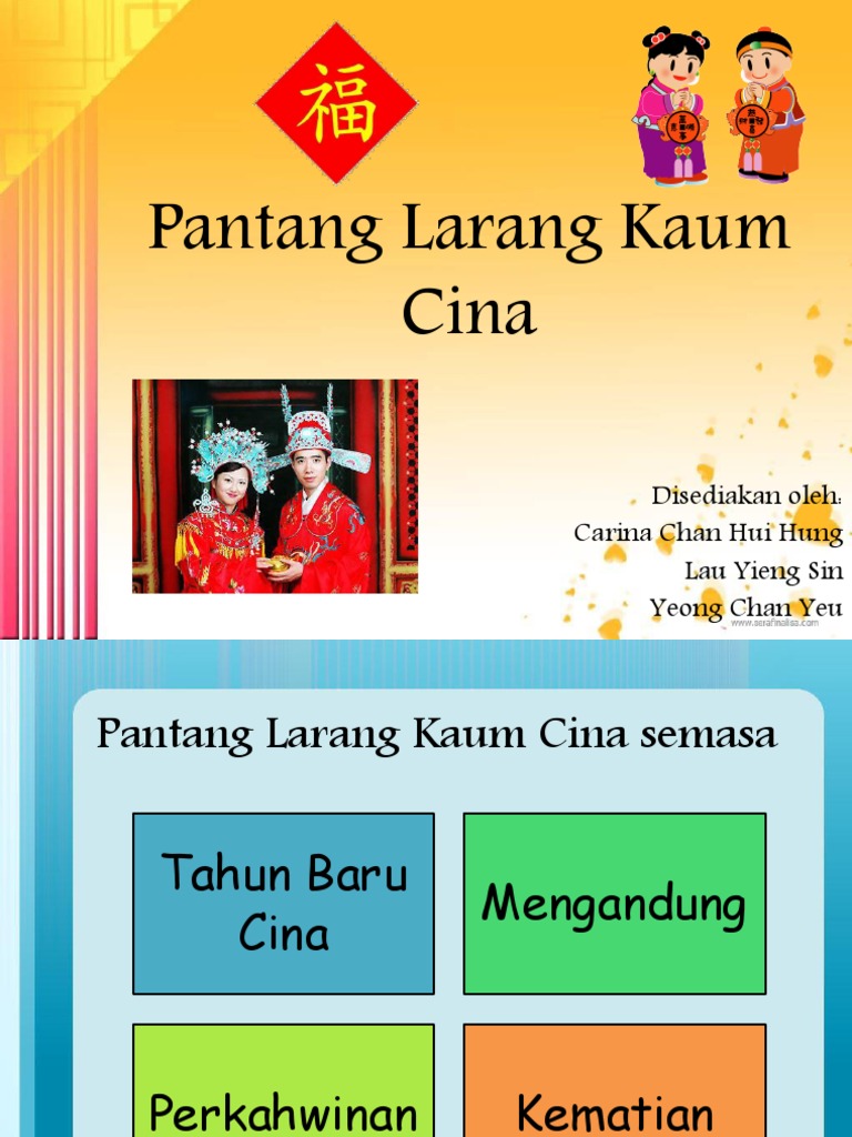 Melayu kaum melayu dengan pantang larang memang tak dapat dipisahkan. Pantang larang masyarakat cina pengenalan masyarakat cina mempunyai adat resam atau pantang larang yang agak unik. Ibu mengandung tidak dibenarkan memaku kerana dikhuatitri anak dalam kandungan cacat akibat terkejut. Pantang larang tentang hadiah.