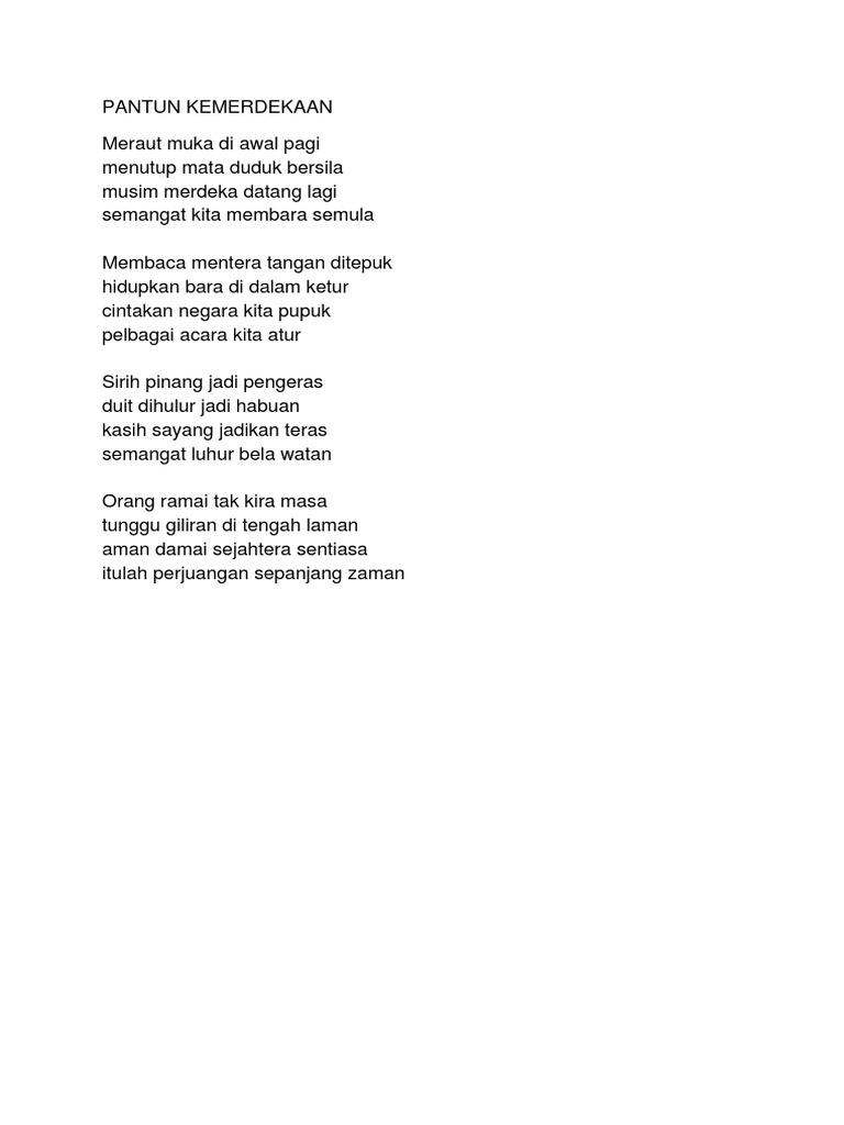 Hargailah jasa pejuang merdeka rumah terbakar panggil bomba ada perompak panggil polis satu bangsa satu negara jangan kita bersikap rasis. Related posts to contoh pantun empat kerat kemerdekaan contoh pantun empat kerat kemerdekaan 2019 09 27t17 12 00 07 00 rating. Su lek moi d20111049797 23 april 2012 at 0714. Gambar ini tersedia dalam format jpg png gif.