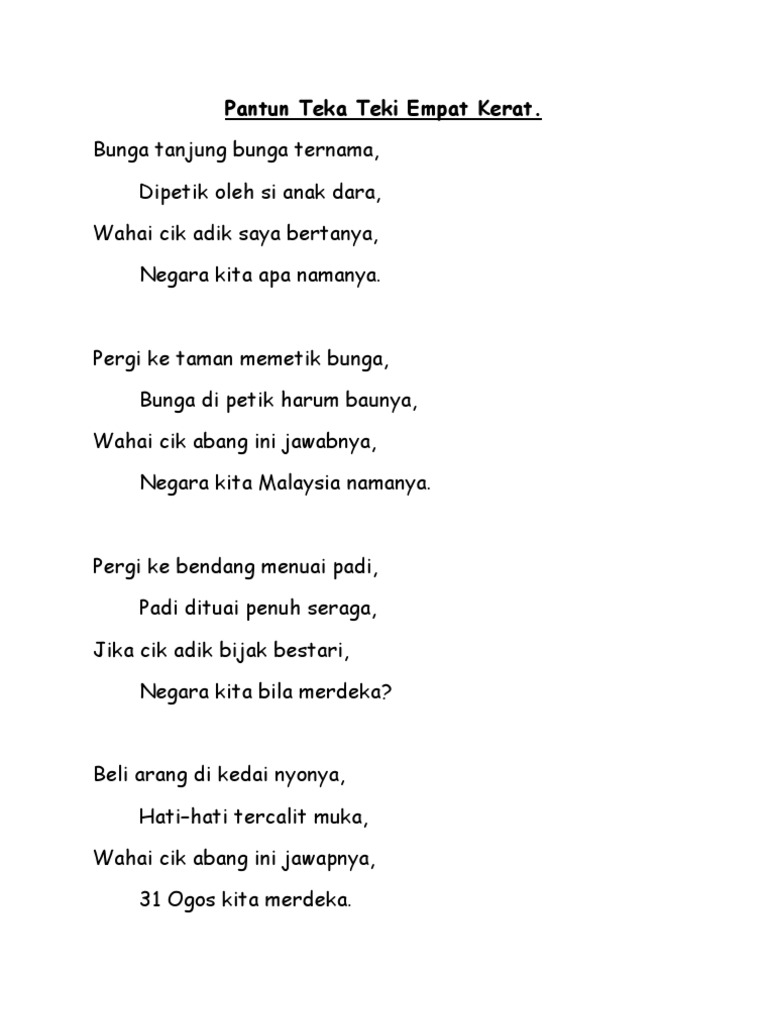 Pantun merdeka 2016 pantun yang digubah istimewa buat semua rakyat malaysia. Contoh pantun nasehat contoh pantun jenaka contoh pantun cinta contoh pantun 4 kerat contoh pantun budi contoh pantun ag. Empat rangkap pantun empat kerat yang telah saya modify dari lirik lagu yang pernah popular zaman 70an dulu sebagai posting pertama pada bulan empat ini. Bangsa melayu bentala merdeka.