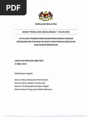 Pekeliling pakaian seragam 2016. 2 tahun 2016 atau arahan lain kerajaan yang dikeluarkan dari semasa ke semasa. Dan jika baju tersebut berlengan. Tatacara permohonan baru penukaran pakaian seragam dan pakaian istiadat kakitangan kerajaan dan badan berkanun lampiran surat pekeliling am. 3 1 agensi menguruskan pembekalan pakaian seragam yang siap dijahit dari kain berkualiti mengikut prosedur perolehan yang berkuat kuasa.