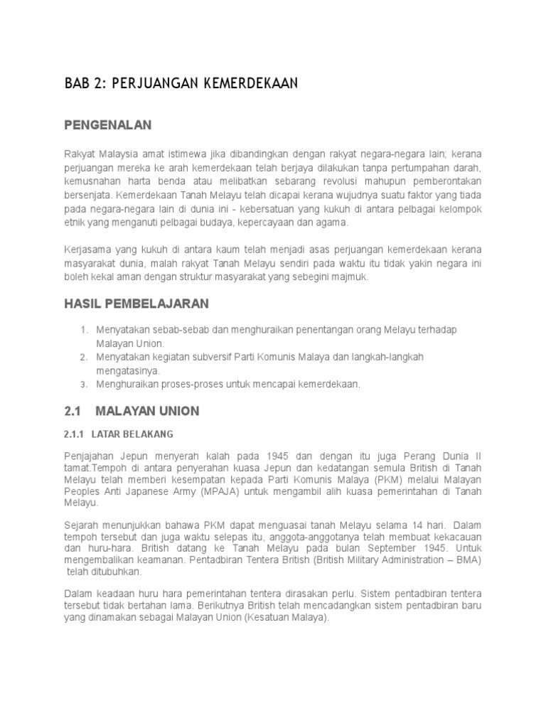 Pengajian malaysia bab 2 kemerdekaan. Perjuangan kemerdekaan dan pembentukkan malaysia bab 2 2 1 perjuangan kemerdekaan. Saturday 11 february 2017. Pengajian malaysia wednesday 17 september 2014. Bab 2 perjuangan kemerdekaan dan pembentukan malaysia malayan union english article the malayan union and impacts the malayan union which the british labour government inaugurated in post war malaya on april 1 1945 lasted slightly more than two years.