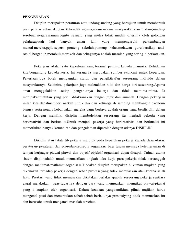 1 selalu datang lewat ke pejabat hal ini terjadi mungkin disebabkan fakor kesesakan jalan raya tak ada kenderaan dan bangun lambat ke tempat kerja. Disiplin merupakan peraturan atau undang undang yang bertujuan untuk membentuk para pelajar selari dengan kehendak agama norma norma masyarakat dan undang undang sesebuah negara namun begitu sesuatu yang mulia tidak mudah diterima oleh golongan pelajar apatah lagi banyak unsur lain yang mempengaruhi perkembangan mental mereka gejla seperti ponteng sekolah ponteng kelas melawan guru bersikap. You are on page 1 of 4. Keseragaman disiplin motivasi dan penglibatan individu keadaan domestik dan ketegangan.