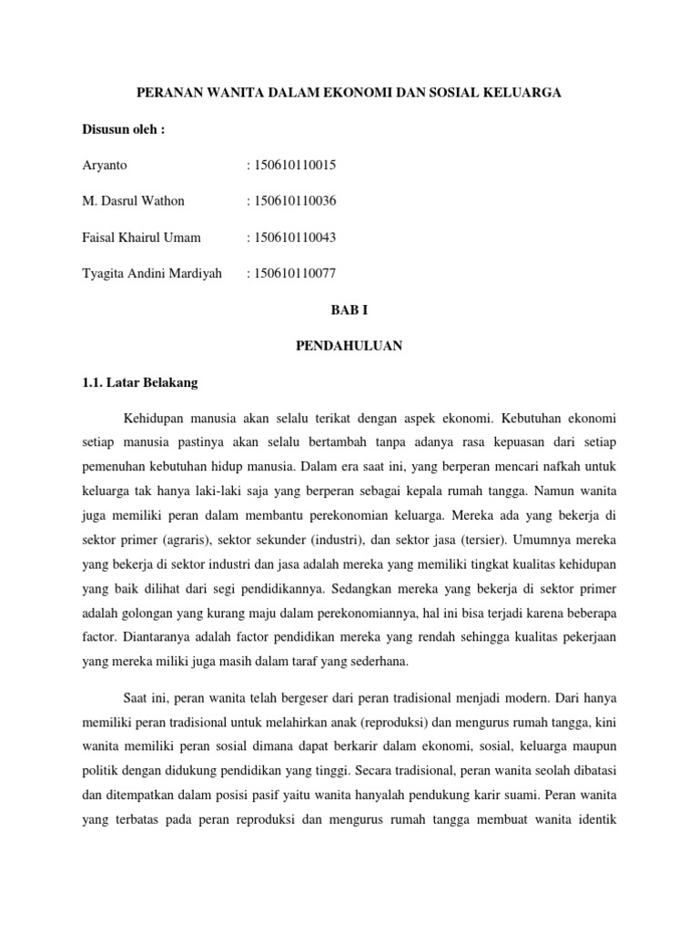 Peranan wanita dalam keluarga. Disini menjelaskan tentang bagaimana peran wanita dalam keluarga dan banyak issue issue gender. Anak adalah pelengkap dari keberadaan suami dan istri dalam membentuk rumah tangga dan sumber kebahagiaan orang tuanya. Secara tradisional peranan isteri adalah untuk mentadbir hal ehwal rumahtangga dan keluarga tetapi dengan timbulnya cara hidup baru berlakulah peruhaban tertentu yang meluaskan lagi peranan para isteri. Peranan wanita dalam menunjang ekonomi keluarga miskin diukur dari sisi pendapatan studi kasus kecamatan kaliwungu kabupaten kendal dityasa hanin forddanta drs.