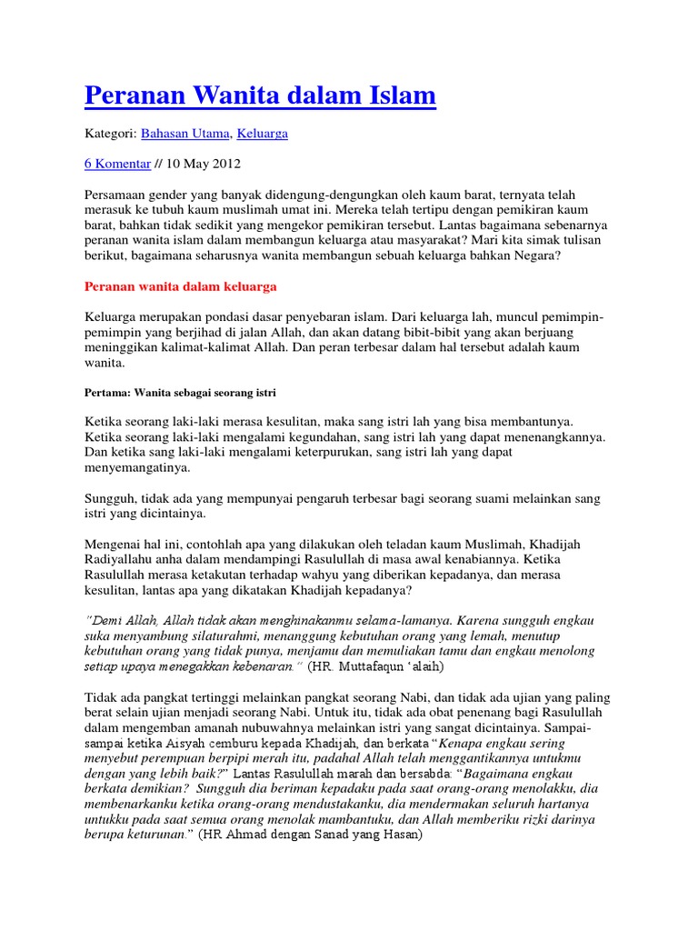 Sejarah kegemilangan umat islam telah memperlihatkan betapa golongan wanita mempunyai kedudukan yang begitu mulia lagi penting dalam masyarakat. Beberapa peran wanita tersebut dalam keluarga intinya adalah. Keluarga merupakan pondasi dasar penyebaran islam. Dan peran terbesar dalam hal tersebut adalah kaum wanita.