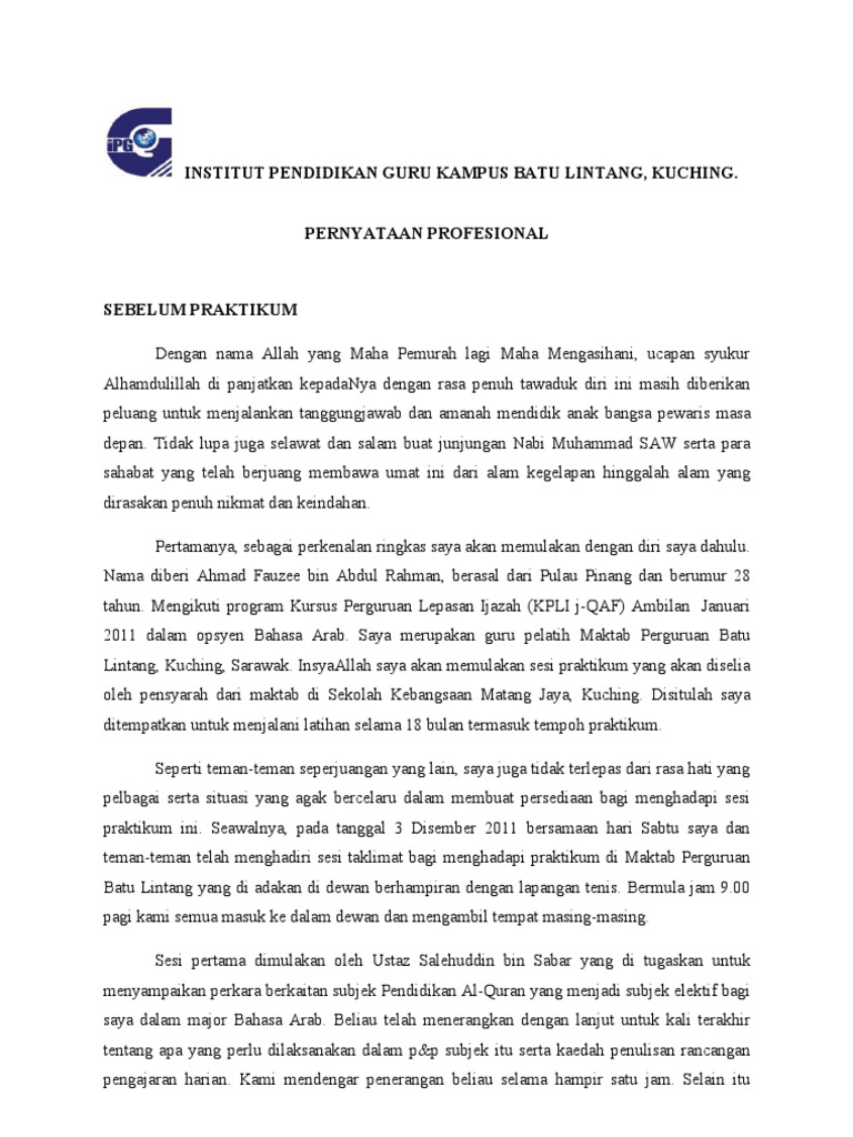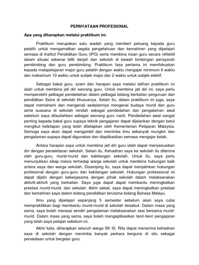 Pernyataan profesional selepas praktikum. Contoh pernyataan profesional praktikum pernyataan profesional semester 7 tahun 2014 merupakan kesinambungan program praktikum yang telah saya lalui pada semester lepas dan praktikum fasa tiga ini dan yang terakhir sebagai guru pelatih di institut pendidikan guru ipg diharapkan dapat mengukuhkan lagi kompetensi saya dalam bidang ini. Sebagai salah seorang guru pelatih di institut pendidikan kampus gaya saya wajib menjalani latihan mengajar ataupun praktikum selama 3 bulan yang bermula pada 10 februari 2020. Laporan pembersihan bilik seni. Pernyataan profesional selepas praktikum.