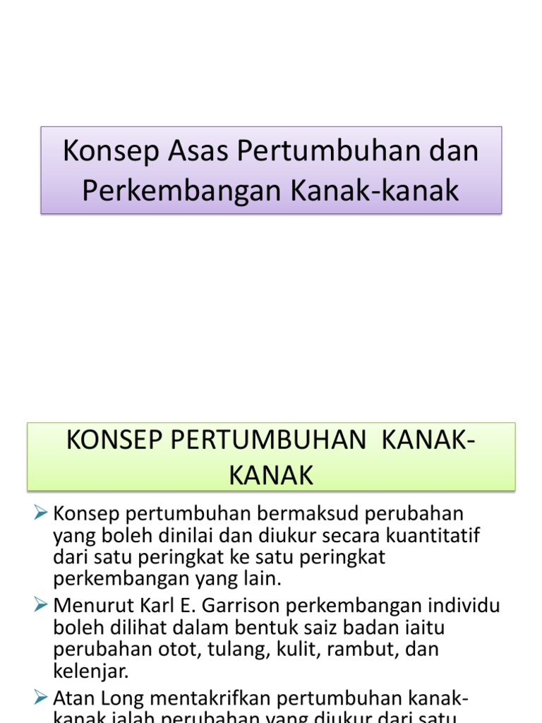 Tumpuan perbincangan akan memperincikan secara khusus definisi pertumbuhan dan perkembangan kanak kanak empat fokus penting kajian perkembangan kanak kanak dari sudut perkembangan fizikal perkembangan kognitif perkembangan afektif dan psikologi perkembangan sosial serta lapan. Perbezaan tersebut dalam kalangan kanak kanak pintar cerdas dapat diperhatikan dan dikenalpasti. Pada manusia terutama pada masa kanak kanak proses pertumbuhan dan perkembangan ini terjadi sangat cepat perubahan yang terjadi pada diri seseorang tidak hanya meliputi apa yang tampak mata seperti perubahan tubuh fisik dengan bertambahnya berat badan dan tinggi badan tetapi juga perubahan dalam segi yang lain seperti berfikir berbahasa berperilaku dan lain lain. Pertumbuhan dan perkembangan kanak kanak hingga awal remaja prinsip prinsip pertumbuhan dan perkembangan pertumbuhan membawa maksud sebarang perubahan yang boleh dinilai atau diukur secara kuantiti dan boleh diukur daripada suatu peringkat perkembangan yang tertentu ke peringkat perkembangan yang lain yang lebih nilainya daripada yang asal.