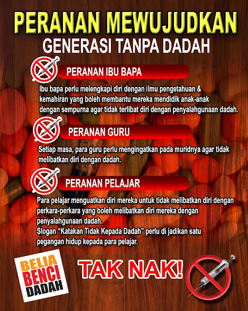 Terdapat beberapa punca atau sebab penglibatan penyalahgunaan dadah terutamanya di kalangan remaja. Nda atau inda dalam bahasa brunei bererti tidak menolak enggan atau tidak mahu. Ppda smk lubok antu lubok antu sarawak malaysia laman ini dibangunkan adalah merupakan one stop centre yang menyediakan akses maklumat pendidikan pencegahan dadah yang lengkap kepada pelajar guru ibu bapa serta komuniti setempat maklumat dan bahan bahan berkaitan ppda dalam pelbagai medium boleh meningkatkan pengetahuan pelajar khususnya tentang bahaya penggunaan dadah rokok inhalan dan. Pertemuan hari ini saya akan memberikan inspirasi tentang contoh poster anti narkoba bersama dengan slogan narkoba.