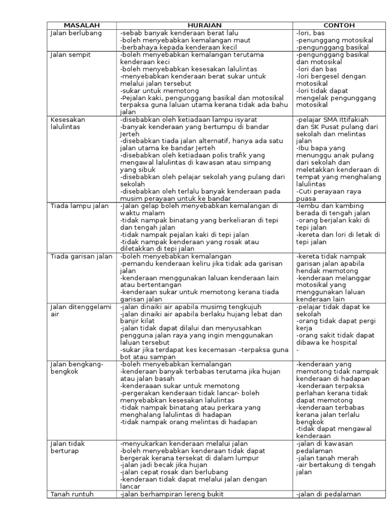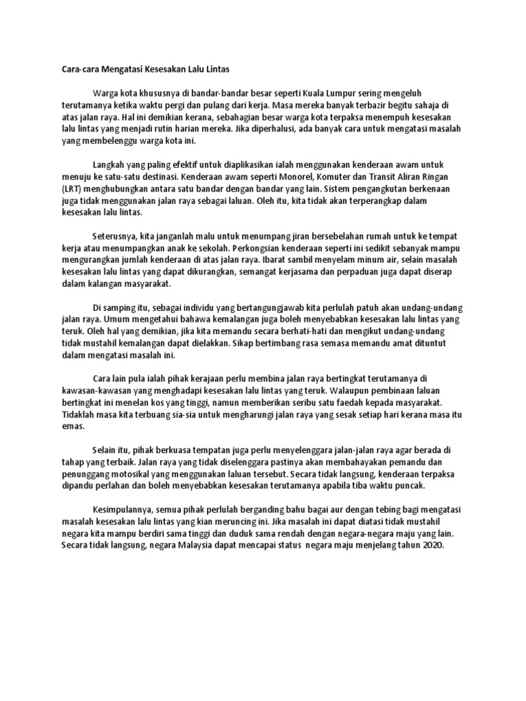 Huraikan sebab sebab berlakunya kesesakan lalu lintas yang berkaitan dengan sistem pengangkutan awam. Kesesakan lalu lintas merupakan satu masalah yang belum dapat diatasi di kota besar seperti kuala lumpur walaupun sistem pengangkutan awam di negara ini semakin hari semakin canggih. Sedangkan kawasan di dalam pagar sekolah masih luas untuk digunakan sementara. Menurut jurnal yang bertajuk review of road safety in urban areas terdapat beberapa langkah untuk mengatasi kesesakan lalu lintas dan keselamatan jalan raya antaranya termasuklah memberikan pendidikan dan menjalankan kempen kempen berkaitan.