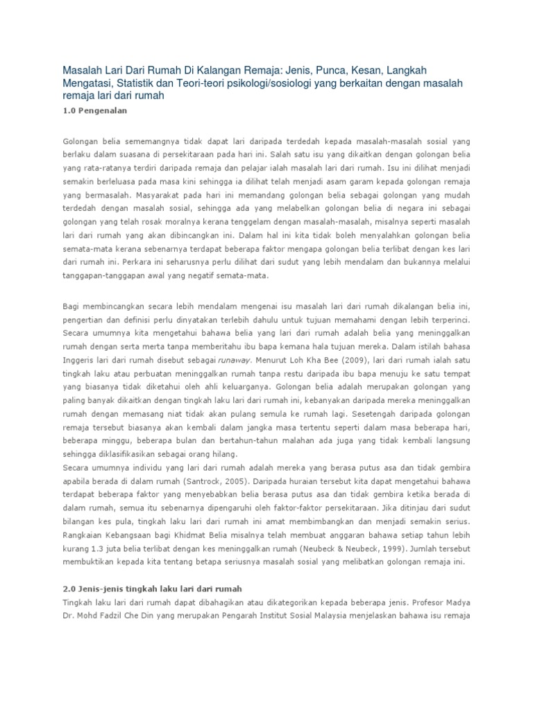 Punca remaja lari dari rumah. Punca yang paling ketara ialah tekanan ibu bapa. Kemelut remaja lari dari rumah telah menjadi satu isu yang sering diperkatakan. Jenis punca kesan langkah mengatasi statistik dan teori teori psikologi sosiologi yang berkaitan dengan masalah remaja lari dari rumah 1 0 pengenalan golongan belia sememangnya tidak dapat lari daripada terdedah kepada masalah masalah sosial yang berlaku dalam suasana di persekitaraan pada hari ini. Punca punca remaja lari dari rumah.